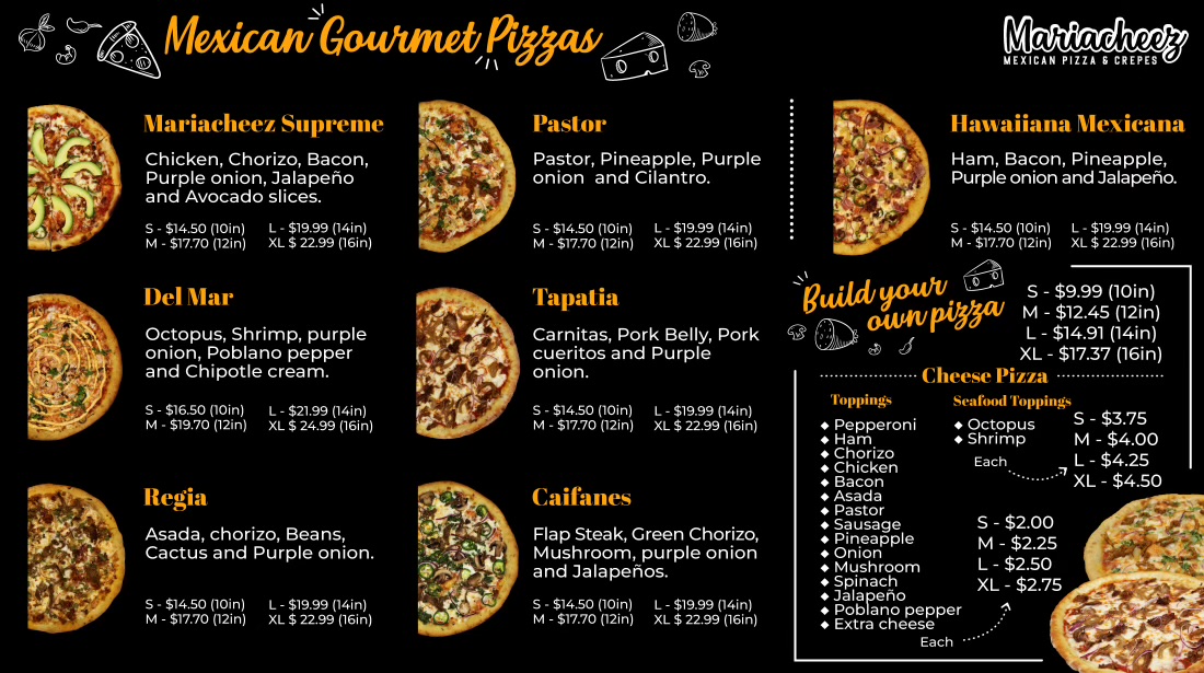 We took the classic supreme and turned up the flavor. The Mariacheez Supreme is loaded with savory pepperoni, smoky hot sausage, crispy bacon, earthy mushrooms, sweet purple onions, and fire-roasted poblano peppers—all perfectly layered on a golden crust. It’s bold. It’s balanced. It’s the kind of pizza that doesn’t hold back. Pepperoni, Smoked Hot Sausage, Bacon, Mushroom, Purple Onion, Poblano Pepper -Pepperoni, Salchicha Picante Ahumada, Tocino, Champiñones, Cebolla Morada, Chile Poblano